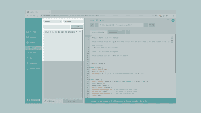 loop() where we will create a receiveEvent() function that is going to run when we get any data received by the board. We can store the data we will receive in the c variable, for ease of use. The data we will receive will be a character, so we need to compare it as such. The if statements will check if the character that was sent is a 1 or a 0. It will then turn on or off the built-in LED depending on the received character.1void receiveEvent(int howMany) {2 char c = Wire.read(); // receive a character3 if(c == '0'){4 digitalWrite(LED_BUILTIN, LOW); // turn the LED off by making the voltage LOW5 }6 if(c == '1'){7 digitalWrite(LED_BUILTIN, HIGH); // turn the LED on (HIGH is the voltage level)8 }9}3. Uploading the code to the reader